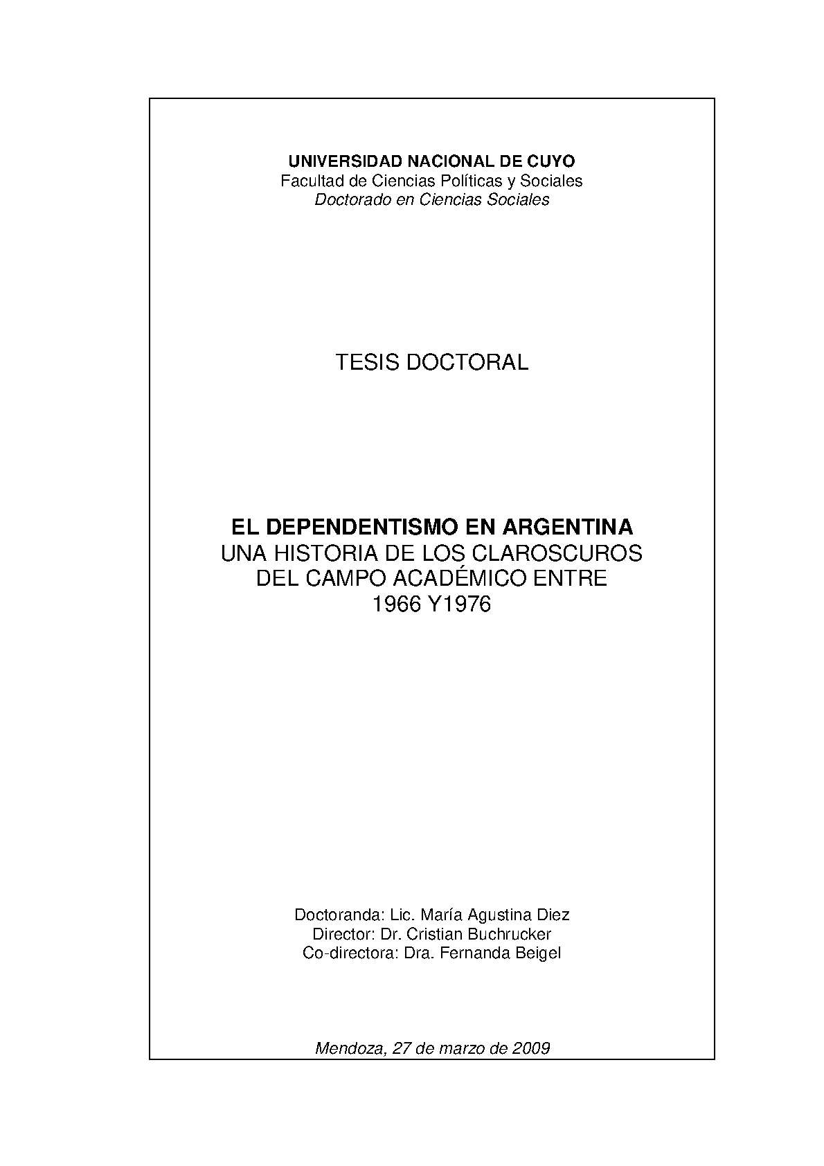 Diez, María Agustina. (2009). El dependentismo en Argentina: una historia de los claroscuros del campo académico entre 1966 y 1976 (Tesis de Doctorado). Mendoza, Universidad Nacional de Cuyo. Facultad de Ciencias Políticas y Sociales .