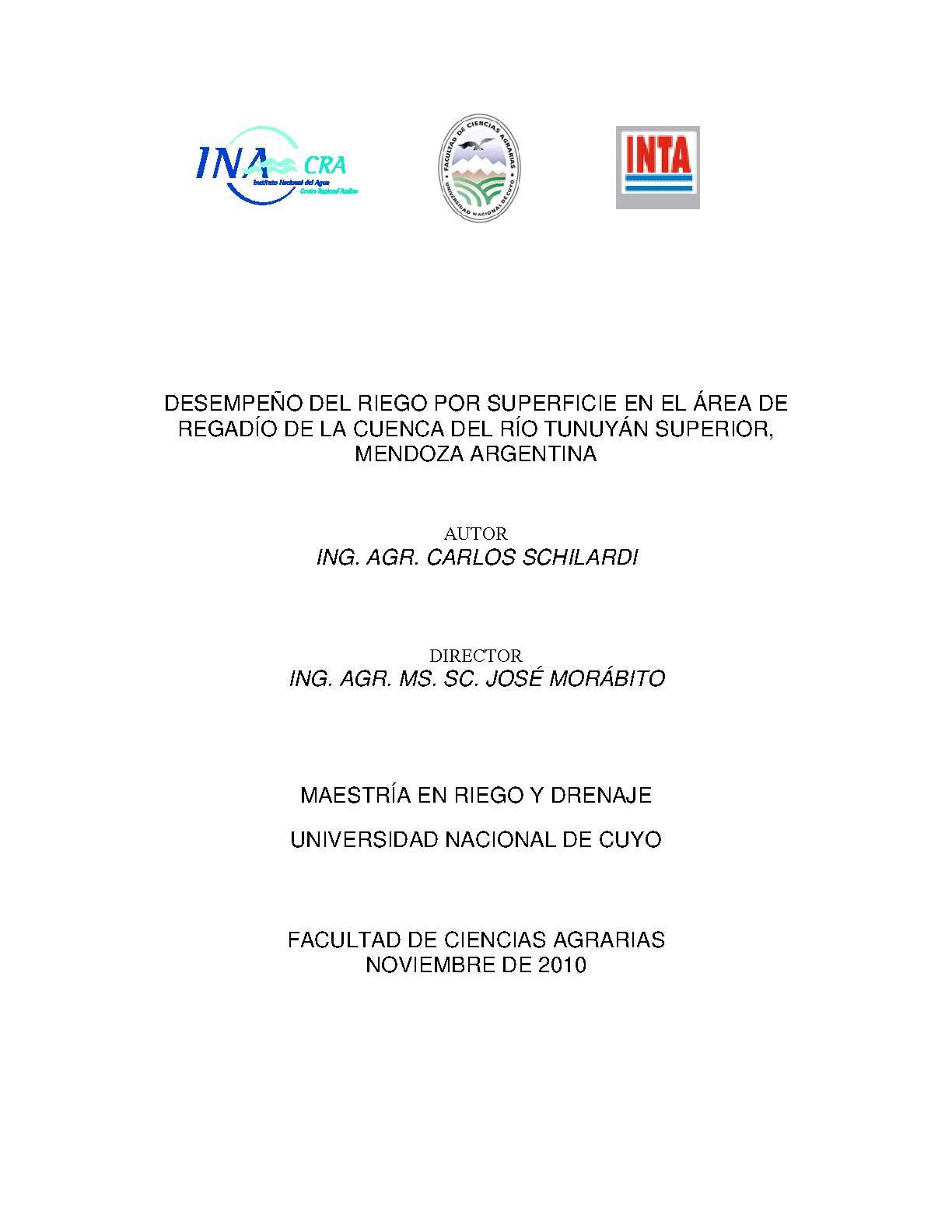Schilardi, Carlos. (2010). Desempeño del riego por superficie en el área de regadío de la cuenca del río Tunuyán superior, Mendoza, Argentina: (Tesis de Maestría). Mendoza, Universidad Nacional de Cuyo. Facultad de Ciencias Agrarias .